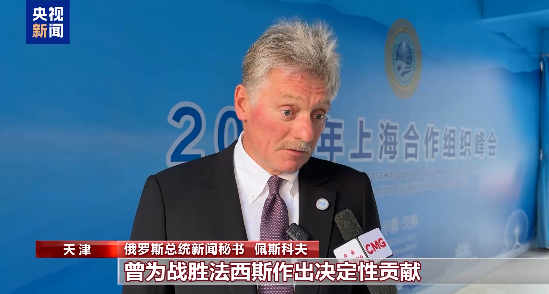 روسی صدارتی پریس سیکریٹری پیسکوف نے شہر تھیانجن میں چائنا میڈیا گروپ کو ایک خصوصی انٹرویو دیتے ہوئے کہا کہ روسی صدر ولادیمیر پیوٹن جاپانی جارحیت کے خلاف چینی عوام کی مزاحمتی جنگ اور عالمی فاشسٹ مخالف جنگ کی فتح کی 80 ویں یاد گار منانے کی تقریب میں شرکت کے لئے چین میں آئے ہیں ۔ اس سے ظاہر ہوتا ہے کہ فاشزم پر فتح میں فیصلہ کن کردار ادا کرنے والے دو ممالک کے طور پر روس اور چین مشترکہ طور پر تاریخی یادوں کا تحفظ کر رہے ہیں۔