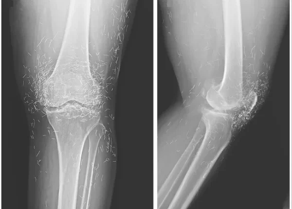 مذکورہ بالا تصویر ایک 65 سالہ خاتون کے گھُٹنے کے ایکسرے کی ہے جس میں دیکھا جا سکتا ہے کہ گھٹنے کے گرد سینکڑوں چھوٹے سونے کے تارموجود ہیں۔