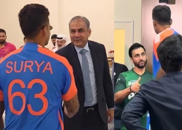 ایشیا کپ 2025 کی ٹرافی کی رونمائی اور کپتانوں کی پریس کانفرنس کے موقع پر سوریا کمار یادیو نے محسن نقوی اور سلمان علی آغا سے مصافحہ کیا جس کی تصاویر وائرل ہوگئیں۔