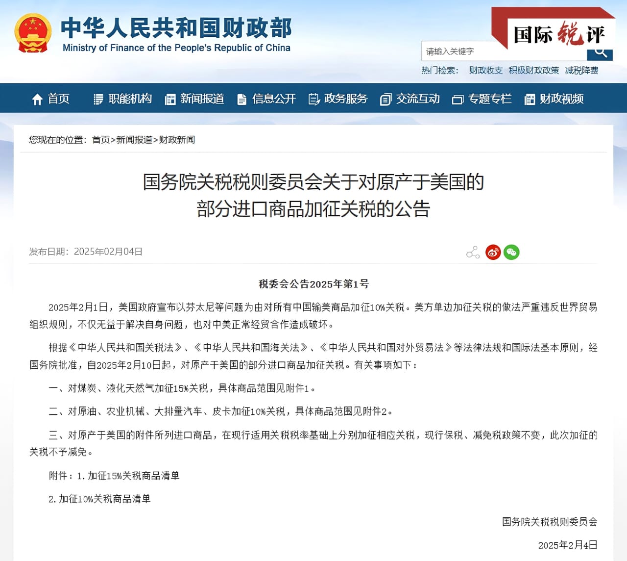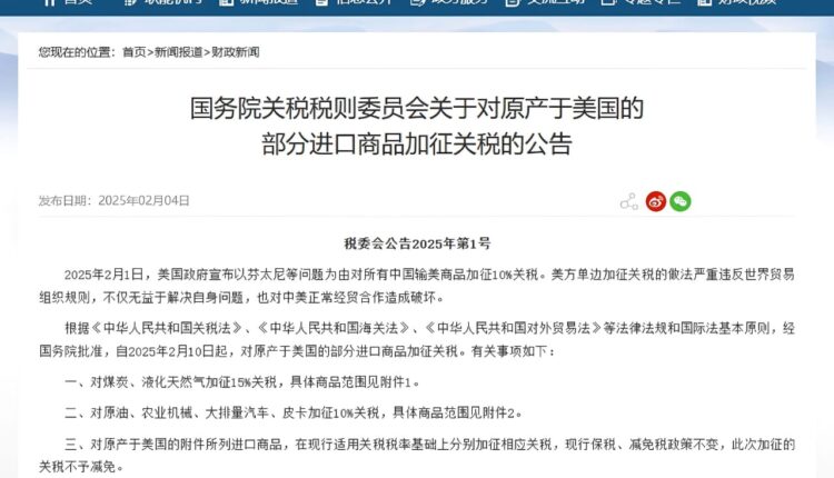 10 فروری 2025 سے چین امریکہ سے درآمد ہونے والے کوئلے اور مائع قدرتی گیس پر 15 فیصد اور خام تیل، زرعی مشینری، بڑی انجن والی گاڑیوں اور پک اپ ٹرکس پر 10 فیصد اضافی محصولات عائد کرے گا۔ تجزیہ کاروں کا خیال ہے کہ چین کے جوابی اقدامات درست اور مؤثر ہیں۔